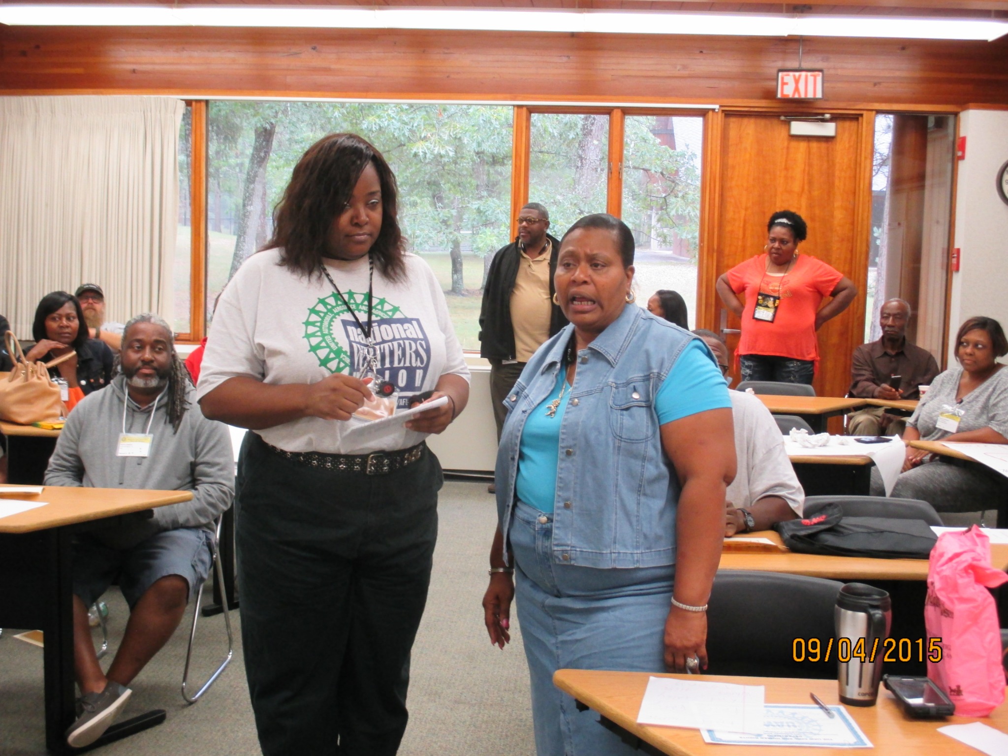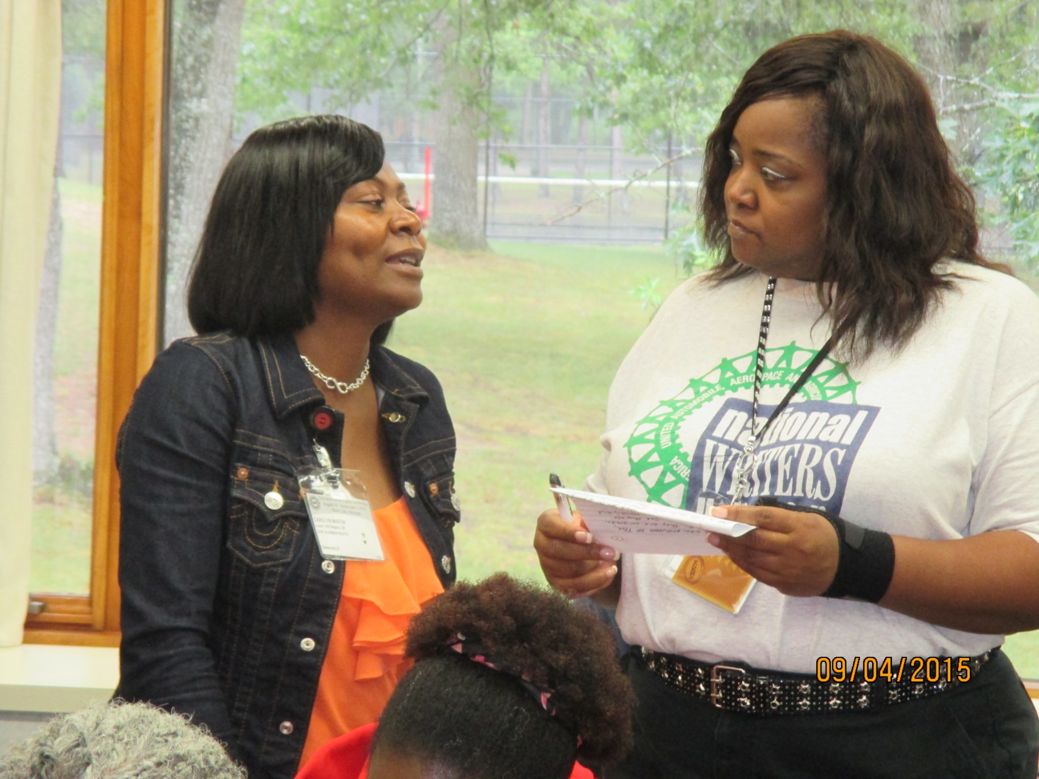 Working with a Union Sister in a UAW Workshop at Black Lake in 2015.